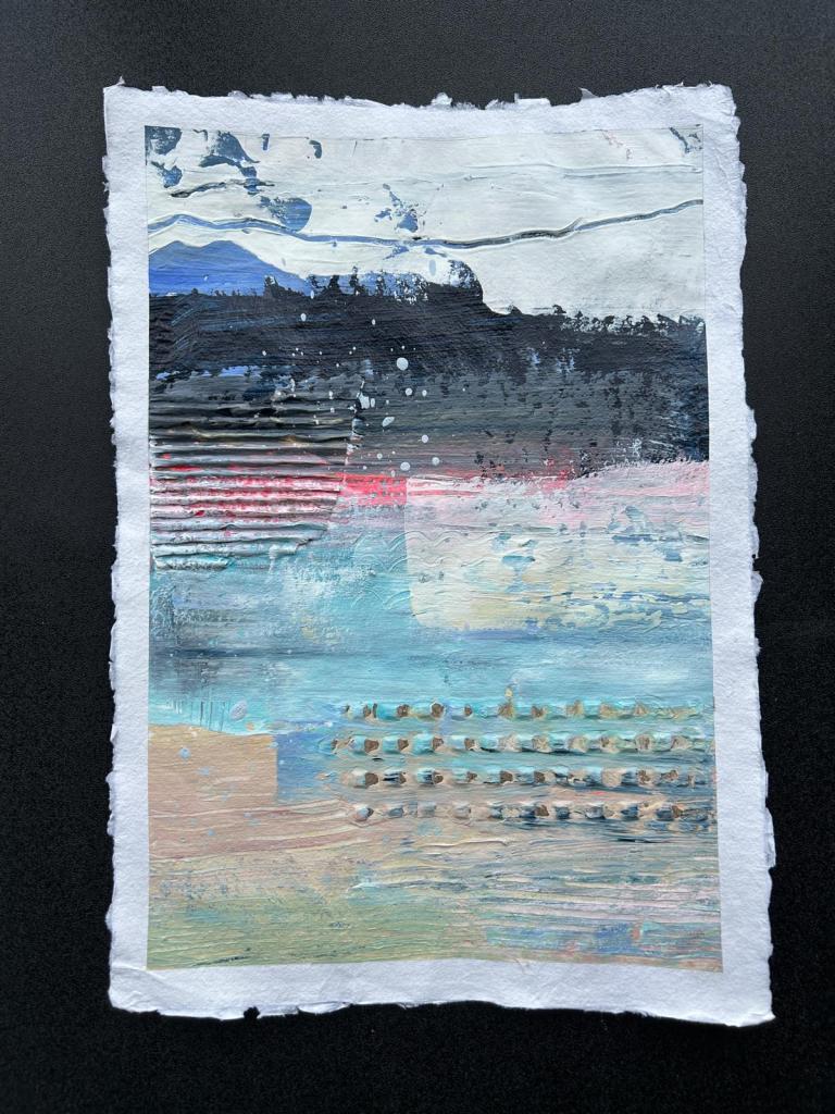 I wanted to capture not just how the place looked, but how it felt: expansive, elemental, and full of movement. Each work combines acrylic paint and collage on handmade deckled paper, using layers of texture and colour to echo the shifting light, the rhythm of the waves, and the solidity of the mountains.