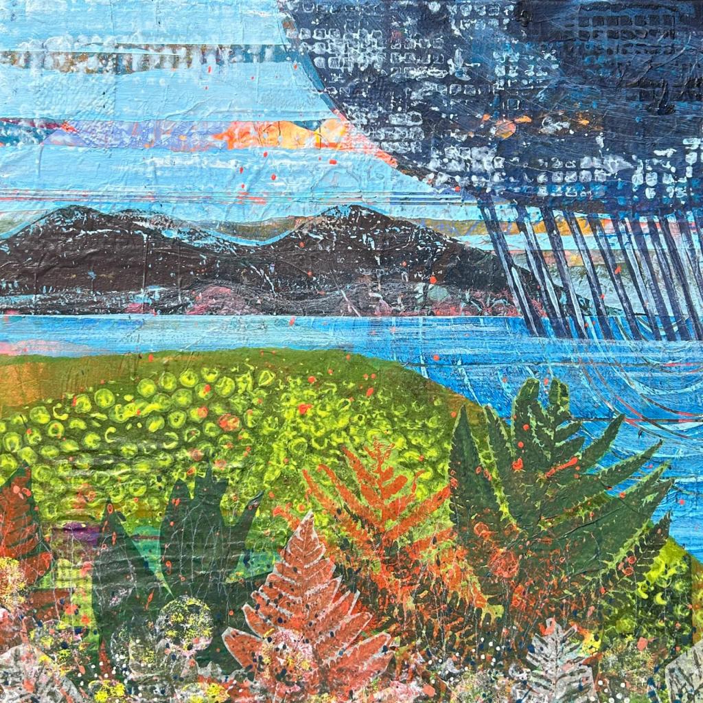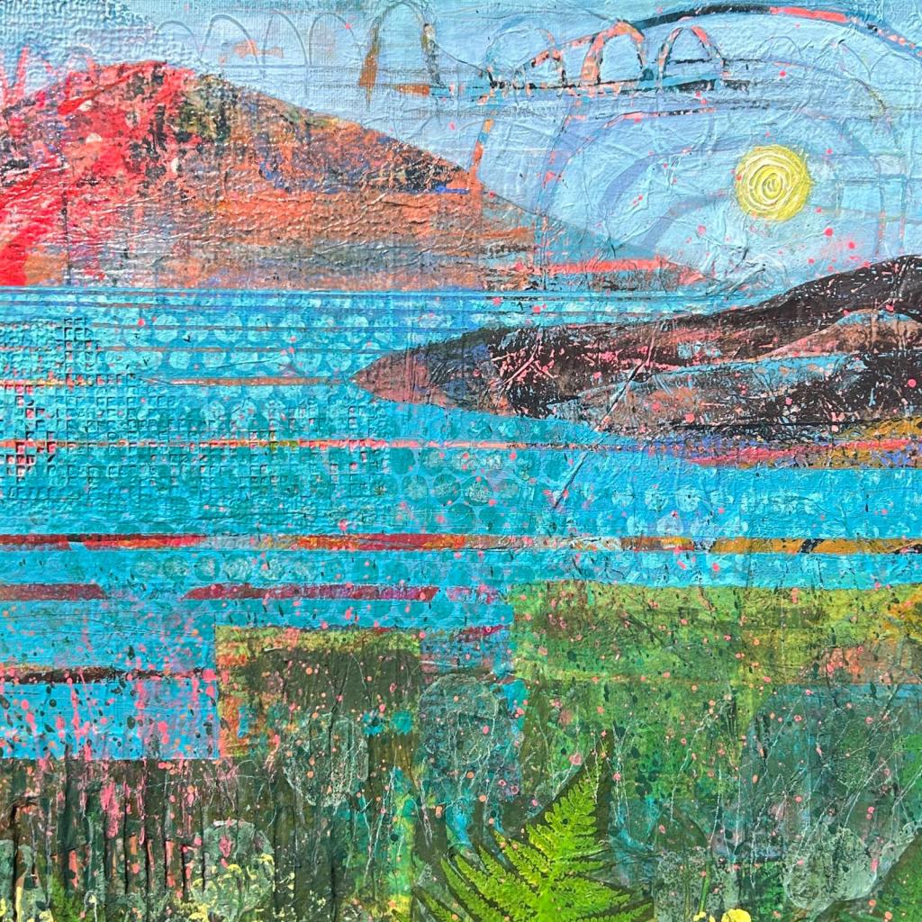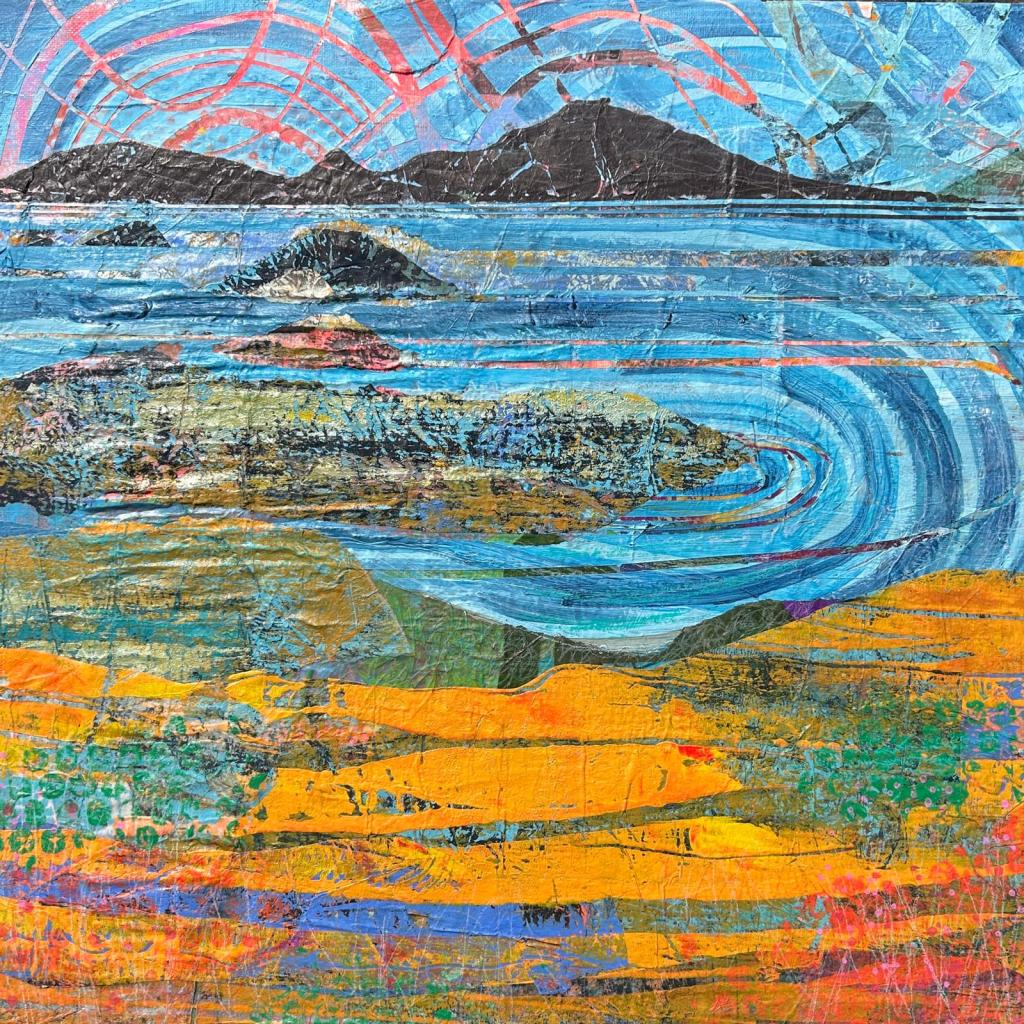 Inspired by the wild beauty of County Kerry, this series of paintings captures the vibrant meeting of sea, sky, and mountain. Created through a richly layered process of collage and acrylic on canvas, each work incorporates hand-printed tissue papers that add subtle textures, occasional glimpses of text, and a sense of depth. Expressive linework and bold graphic energy infuse the landscapes with life, while vibrant, rhythmic patterns animate the sea and sky.