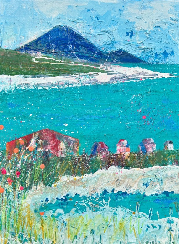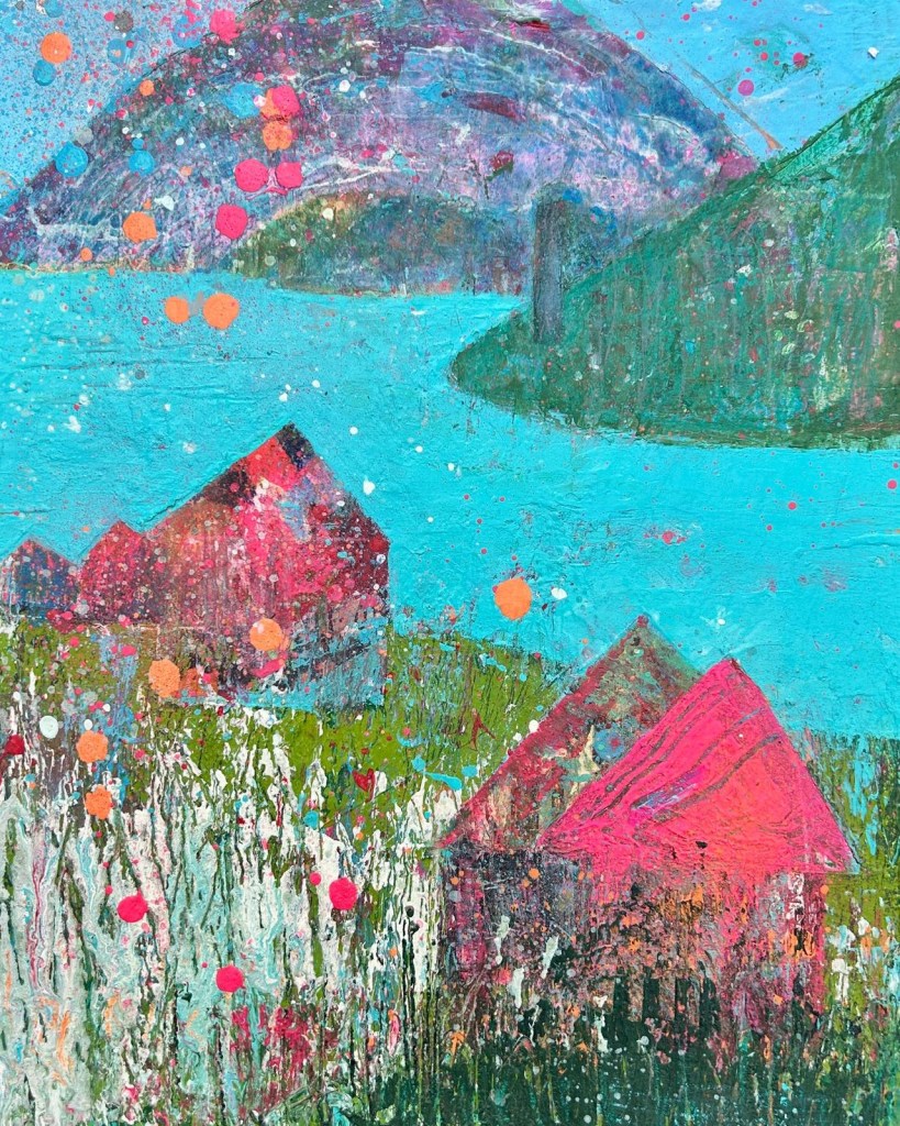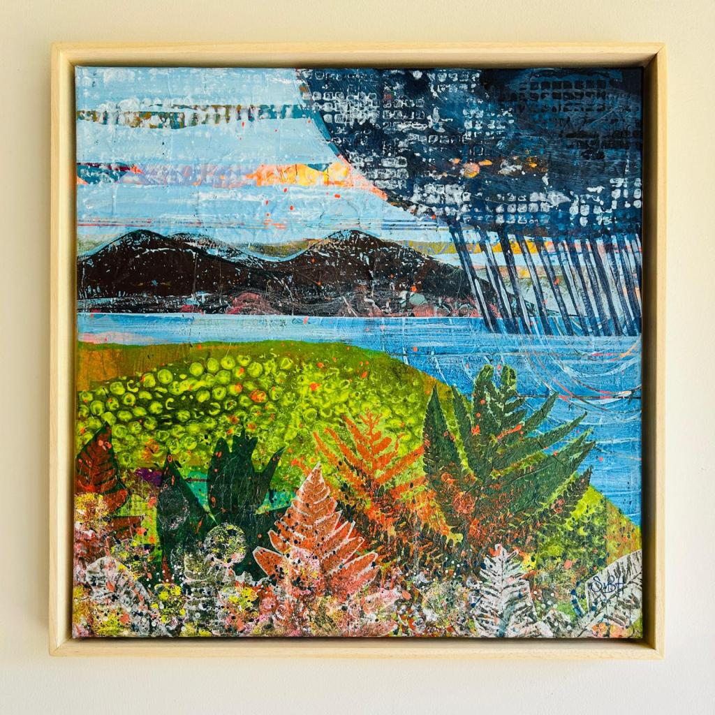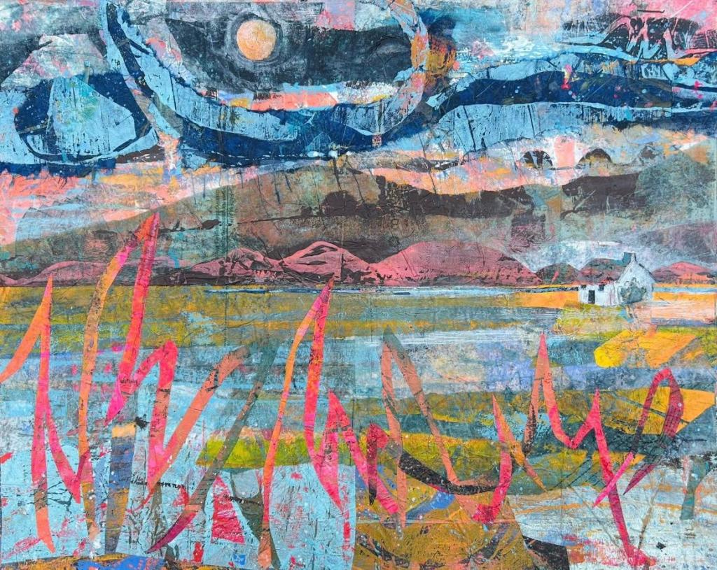 Inspired by the wild beauty of County Kerry, this series of paintings captures the vibrant meeting of sea, sky, and mountain. Created through a richly layered process of collage and acrylic on canvas, each work incorporates hand-printed tissue papers that add subtle textures, occasional glimpses of text, and a sense of depth. Expressive linework and bold graphic energy infuse the landscapes with life, while vibrant, rhythmic patterns animate the sea and sky.