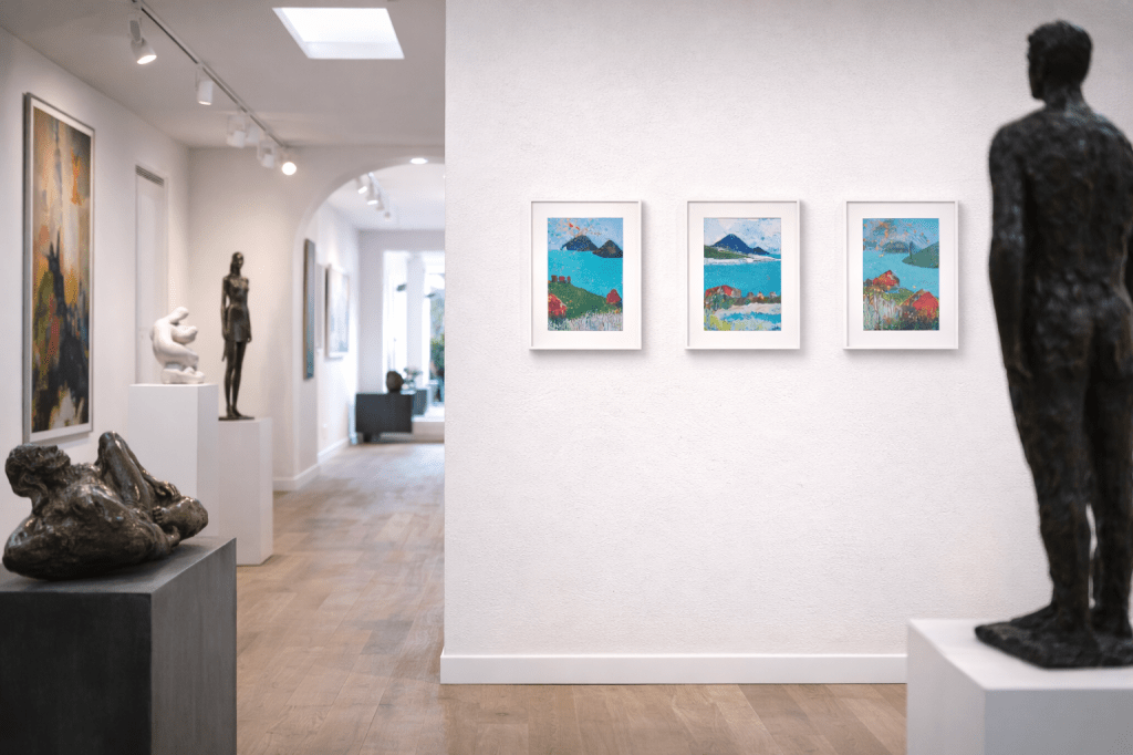As an addition to my Land and Sea Series, I am delighted to share three new paintings. These works continue my exploration of coastlines and seascapes, this time infused with a heightened sense of summer light and energy. Each piece draws on vibrant blues and their complementary contrasts to capture the brilliance of sparkling seas and the warmth of long summer days. Distant lands and islands appear on the horizon, anchoring views that celebrate the intensity of colour, heat, and the luminous clarity of sunlight by the sea.