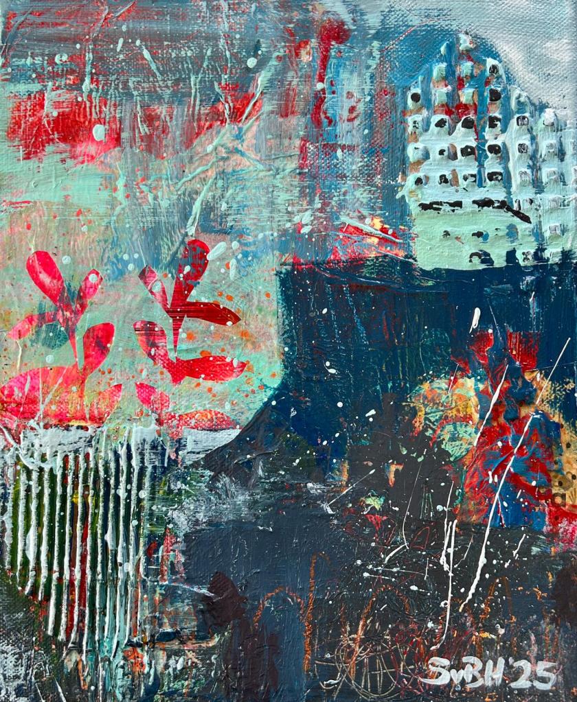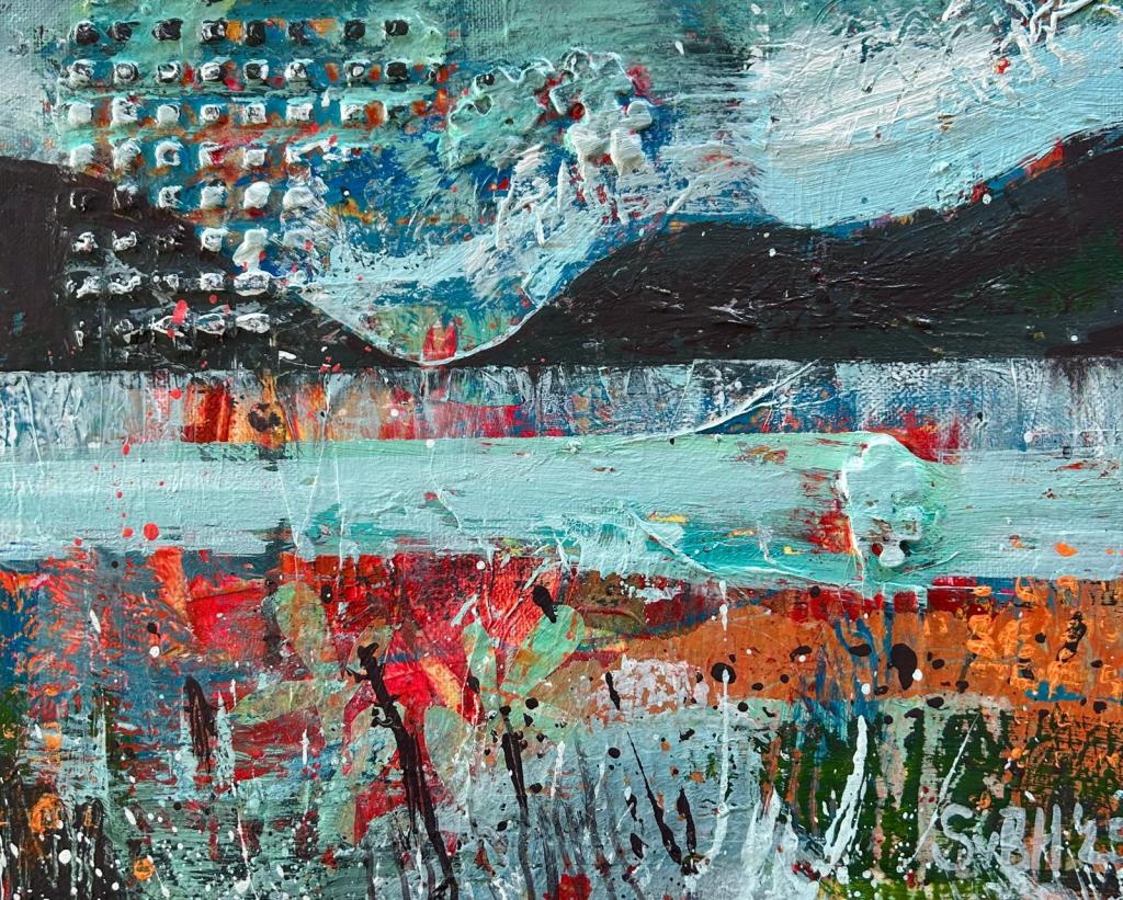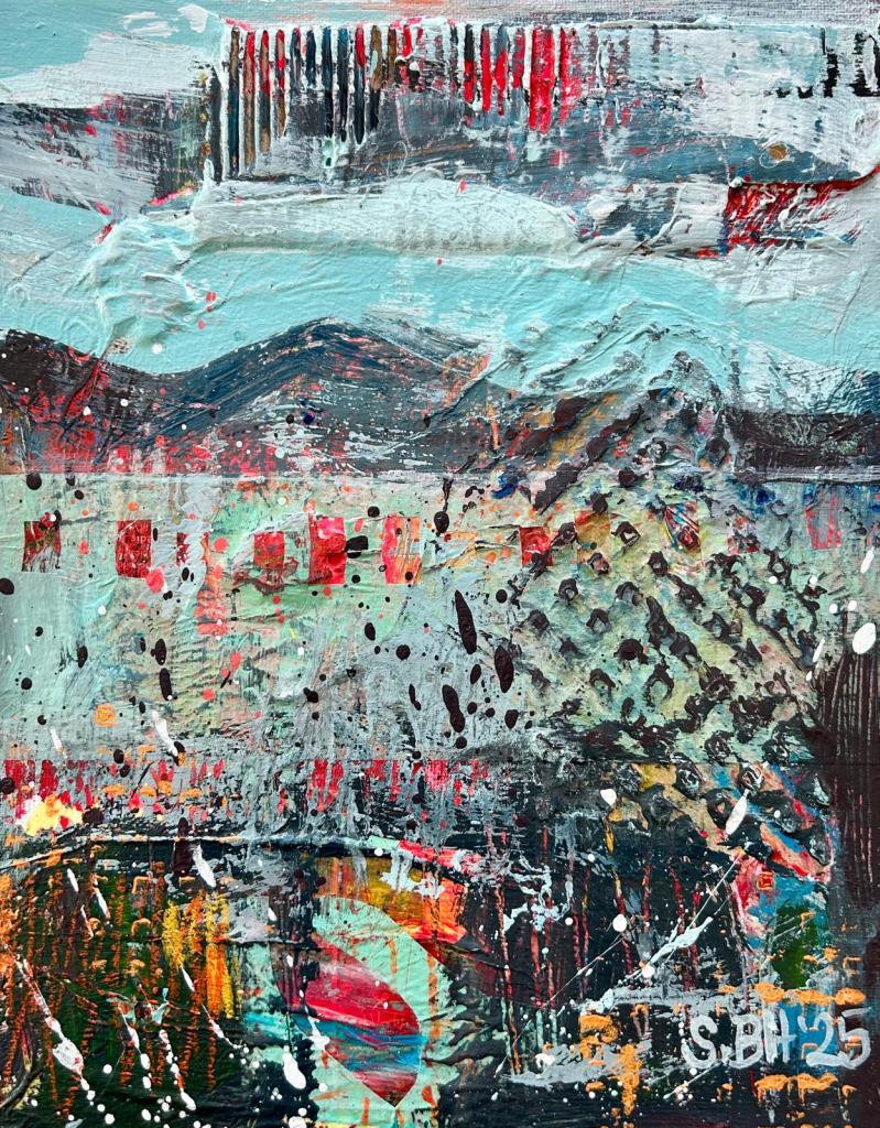 These four new works, each 30 × 24 cm, are made with acrylic paint layered over collaged paper and cardboard, with printed tissue papers capturing textures both delicate and dynamic. The compositions reflect the interplay of land, water, and sky, and the constant movement of light and weather. Elements collected from the beach are echoed in the materials themselves, creating a dialogue between memory, place, and the tactile reality of the shore. Each painting is a fragment of that experience, a moment captured where observation and material meet, inviting the viewer to wander along these shifting shores.